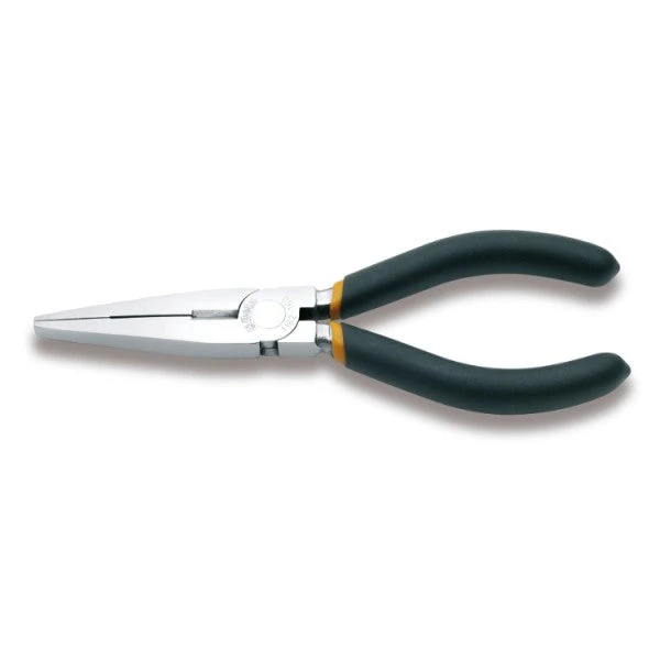 Pinze a becchi piatti lunghissimi diritti zigrinati, cromate, manici ricoperti con 2 strati di PVC antiscivolo