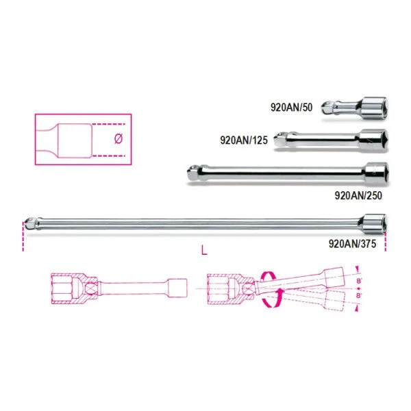 Prolunghe con attacchi quadri maschio e femmina 1/2″ angolari, cromate